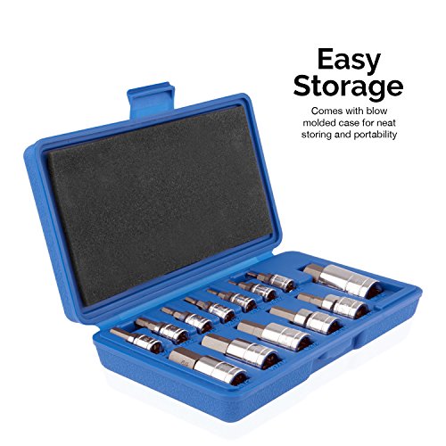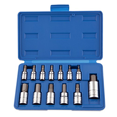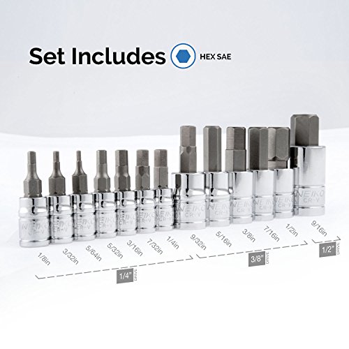 - 13-Piece SAE hex bit socket set includes: 1/4” Drive: 5/64”, 3/32”, 1/8”, 5/32”, 3/16”, 7/32”, 1/4”; 3/8” Drive: 9/32”, 5/16”, 3/8”, 7/16”, 1/2”; 1/2” Drive: 9/16