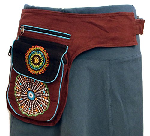 -. Feature : 100% cotton / fits waist 30"-38" / decorated with embroidery and prints / 2 front pockets (7.5"x 5'5"x1 ,6"x7") / 1 secret back pocket (6"x7")