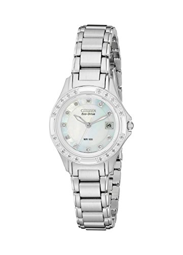 -. Feature : Eco drive technology is fueled by light and it never needs a battery / 31 diamonds / Mineral crystal / Case diameter 26 millimeters / Water resistant to 330 feet (100 M): suitable for snorkeling, as well as swimming, but not diving