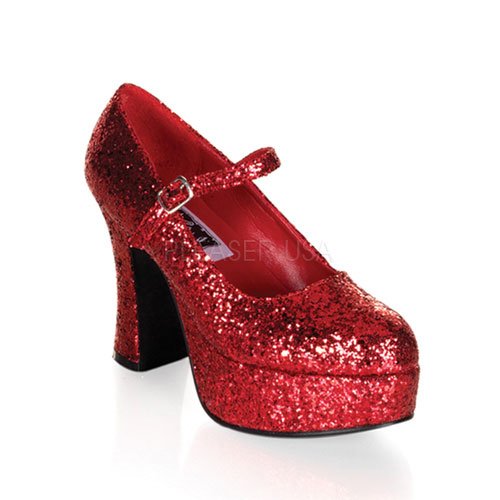 Product Description Heel Height: Approx. 4' Tall. You will love these platform mary janes. These sexy shoes have a chunky four inch heel with a glitter adorned upper. 0