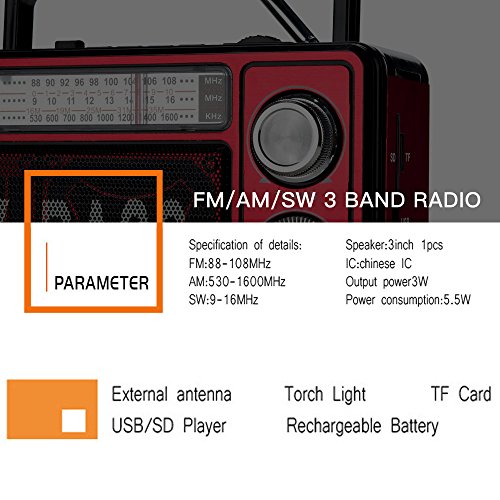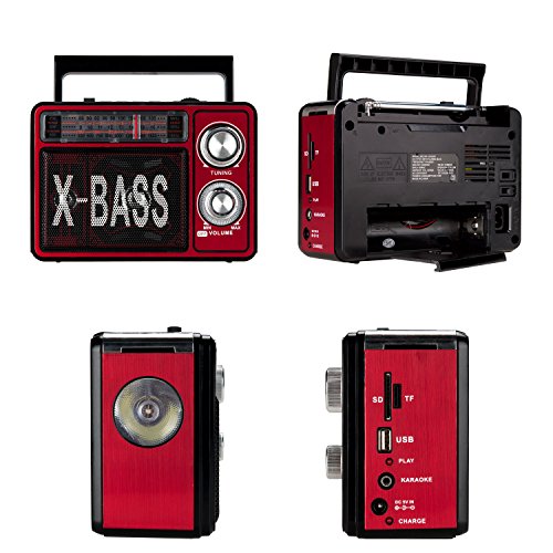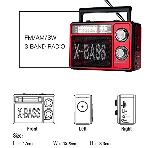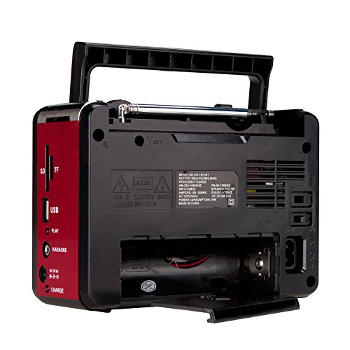 Studio : Lychee Limited Publisher : Lychee Limited Binding : Electronics Product Description Function Parameters: FM/AM/SW Radio: Yes. FM: 88-108MHz; AM: 530-1600MHz; SW: 9-16MHz USB/TF/SD Card: Yes. Max 16GB (Card Not Included) Loop play back: Yes Karaoke: Yes Recording: No Headphone jack: No Materials: ABS UV Input Power: Power adapter 110V to 5V; rechargeable lithium battery Output Power: 3W Support: 2 x D Battery (Not Included) Working Voltage: DC 3V Lithium Battery Capacity: 1600mAH Speaker: 3*4Ω5W Charge Time: 2 hours Working Time: 6 hours Size: 17*12.5*8.3cm/6.7*4.9*3.2inches Weight: 690g/1.5lb