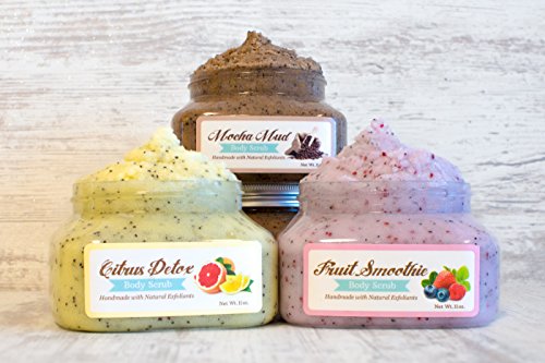 Try our new Body Scrub Sampler, where you can buy three body scrubs for the price of two! Citrus Detox Scrub - Natural exfoliants of sea salt and poppy seeds combine with the refreshing aroma of the essential oils of pink grapefruit, tangerine, bergamot and lemon. Skin-loving coconut oil, shea butter and olive oil nourish and moisturize while massaging away dead skin cells. Fruit Smoothie Scrub - Natural exfoliants of sugar, blueberry seeds and cranberry seeds combine with the sweet aroma of strawberry, banana and peach perfume oils and pure tangerine essential oil. Skin-loving coconut oil, shea butter and sweet almond oil nourish and moisturize while massaging away dead skin cells. Mocha Mud - Scrub Natural exfoliants of sugar and ground coffee combines with Moroccan lava clay and anti-oxidant rich cocoa powder, creating a mud mask for your body. Skin-loving coconut oil, cocoa butter and sweet almond oil nourish and moisturize while massaging away dead skin cells and exciting circulation.Feature