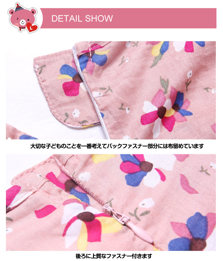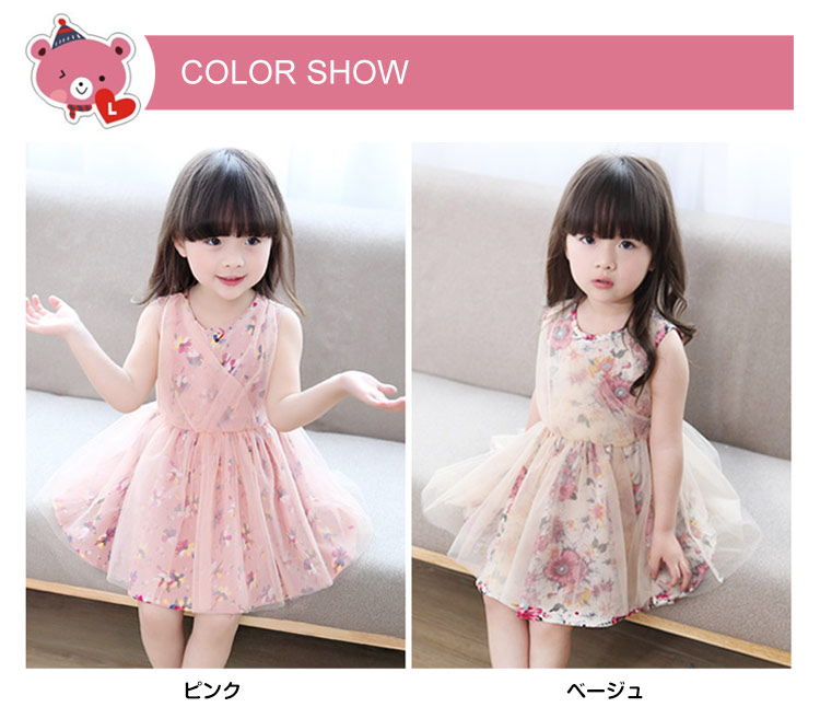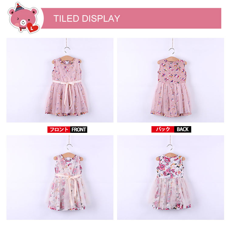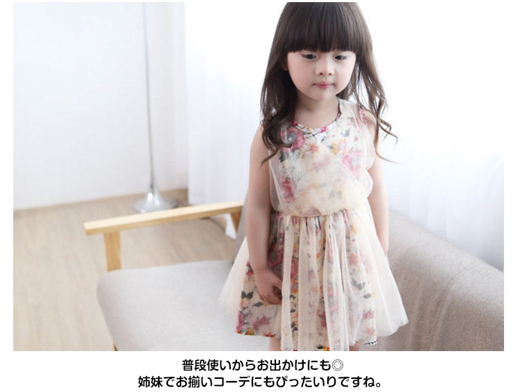 | チュール×花柄が可愛い女の子ワンピース。ふんわりボリュームのスカートも可愛い。夏らしいノースリーブになってもポイント。やわらかな綿素材が通気性抜群で着心地もよい。普段使いからお出かけにも◎姉妹でお揃いコーデにもぴったいりですね。 | |