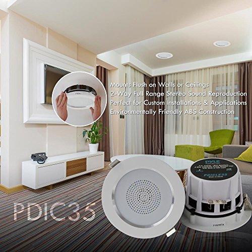-. Binding : Electronics -. Brand : Pyle -. Color : White -. EAN : 0068888770446 -. Feature : SEAMLESS INTEGRATION - Perfect for existing home theater systems this Pyle 2-way in-ceiling or in-wall speaker system delivers incredible stereo sound to any room in your home from speakers you can barely see without using any floor or shelf space. / EASY TO INSTALL - Includes a cut-out size template and quick connect sP.R.Ing-loaded speaker terminals for simple, easy, no hassle installation, in any room, delivering a full rich sound without cluttering floor space. / ALUMINUM FRAME - Lightweight aluminum frame housing providing an extra line of safety & heat-resistance with integrated sP.R.Ing-loaded clips for secure & flush wall mounting. Stain-resistant grill covers & ABS construction. / FLUSH MOUNT DESIGN - Compact flush mount design for simple easy installation in-wall / in-ceiling , or pre-cut speaker openings, for in home use, office, professional, or custom audio applications on any flat surface. / HIGH QUALITY - Pair of 3.5'' reinforced polypropylene cones with suspension cloth & 1/2'' High Compliance Polymer Tweeter. Enjoy a more consistent & enhanced sound field with full range stereo surround sound reproduction. -. Label : Sound Around -. Manufacturer : Sound Around -. Model : PDIC35 -. MPN : PDIC35 -. PackageQuantity : 1 -. PartNumber : PDIC35 -. ProductGroup : Speakers -. ProductTypeName : SPEAKERS -. Publisher : Sound Around -. Studio : Sound Around -. Title : Pyle Pair 3.5” Flush Mount In-wall In-ceiling 2-Way Home Speaker System Aluminum Housing SP.R.Ing Loaded Clips Dual Polypropylene Cone Polymer Tweeter Stereo Sound 140 Watts (PDIC35) -. UPC : 068888770446 -. Warranty : 1 Year Limited