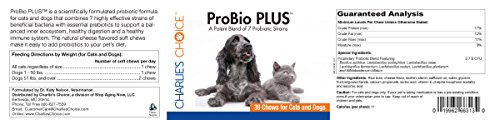 -. Binding : Misc. -. Brand : Charlie's Choice -. Feature : Formulated with the guidance of Katy Nelson, DVM with 7 highly effective strains of beneficial bacteria along with prebiotics / Featuring a potent 2.7 billion CFU count of friendly bacteria in each natural cheese flavored soft chew / Enhanced with fructoogliosaccharides, which are prebiotics that act as food for the friendly bacteria and help to promote their grow / Supports a balanced inner ecosystem for optimal digestive health and an optimally functioning immune system in both cats and dogs / Made in an FDA inspected facility to meet the stringent standards of US Pharmacopeia for quality, purity, potency and disintegration -. Label : Stop Aging Now -. Manufacturer : Stop Aging Now -. MPN : PBP -. PackageQuantity : 1 -. PartNumber : PBP -. ProductGroup : Pet Products -. ProductTypeName : PET_SUPPLIES -. Publisher : Stop Aging Now -. Studio : Stop Aging Now -. Title : Charlie's Choice ProBio PLUS for Cats and Dogs