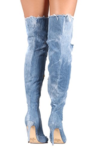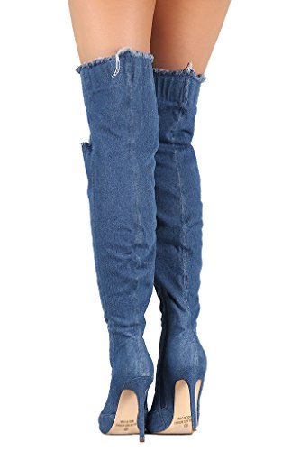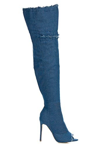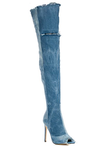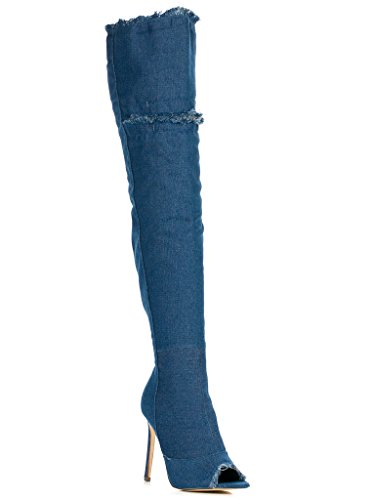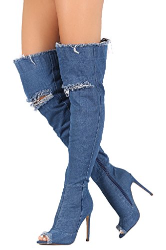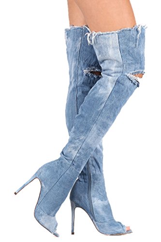 Binding : Apparel Product Description These stunningEover-the-knee bootsEfeature a peep toe silhouette, distressed denim shaft with a fringed opening and a stringy destroyed patch at the knee. Finished with a cushioned insole, soft lining, and partial side zipper closure for easy on/off. Distressing may vary slightly. 0