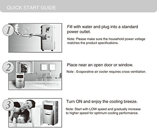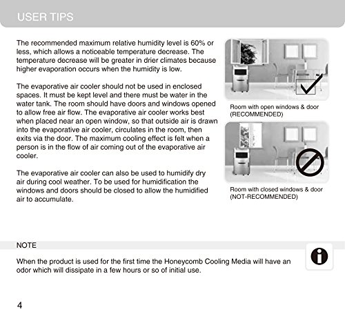 -. Feature : Uses significantly less electricity than an Air Conditioner in a room up to 280 sq. ft. / BEST for hot dry climates, where the air humidity is low / Non-compressor system cools naturally, efficiently and inexpensively (470 CFM air flow) / Used with open windows and doors, no permanent installation required / Top-loading ice compartment plus 5.3-gallon (42-pint) water tank with fill door, water level indicator and low water alarm