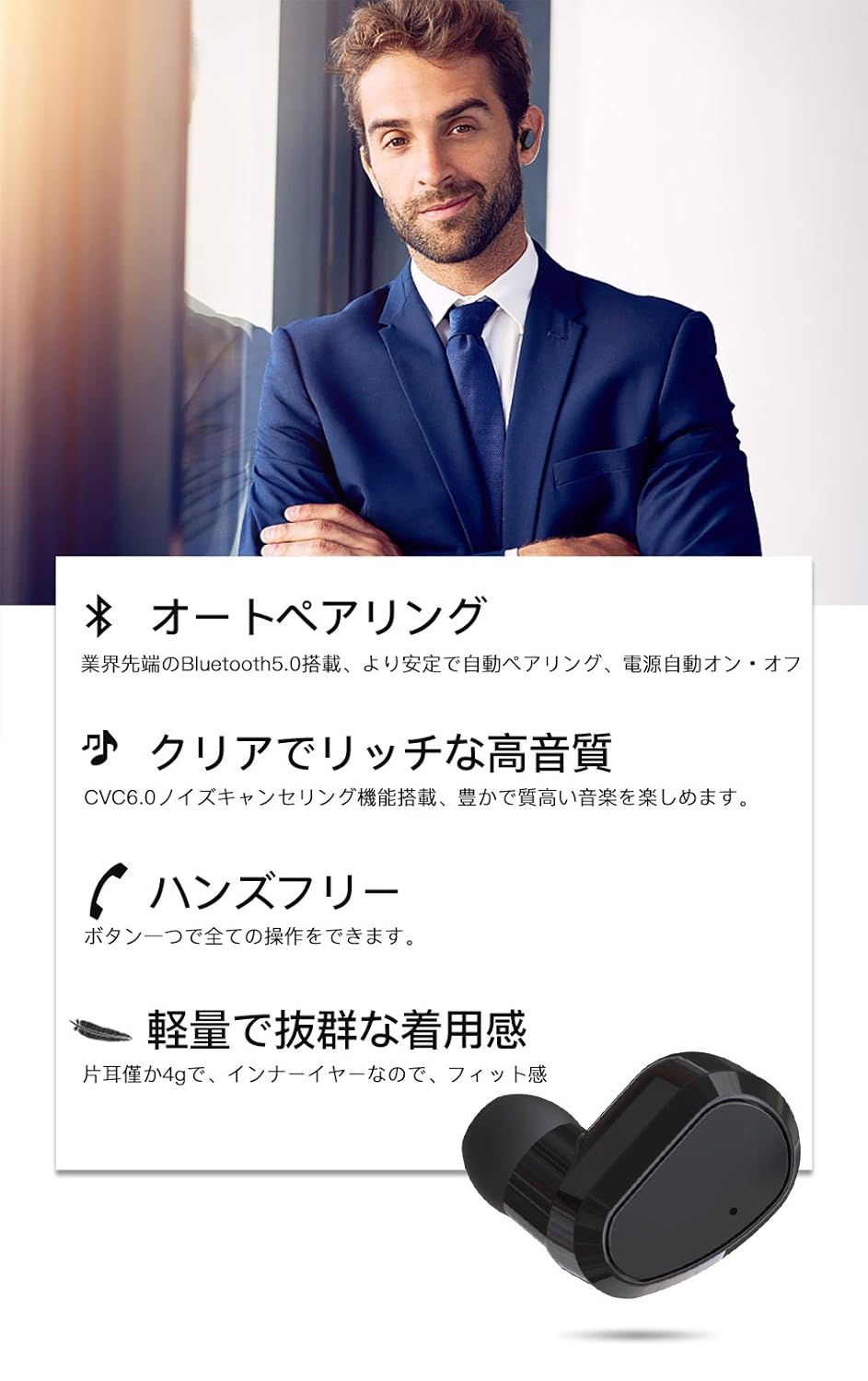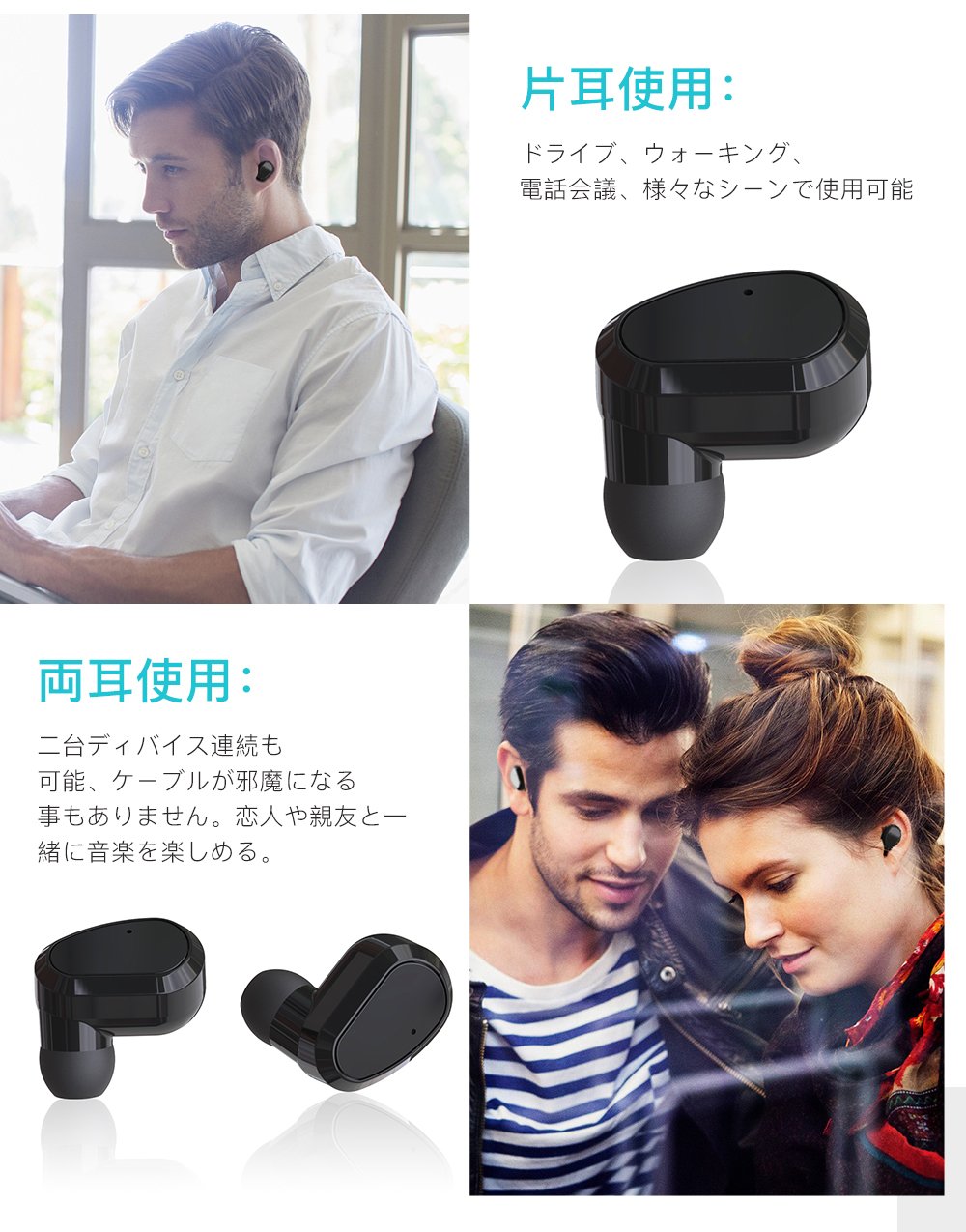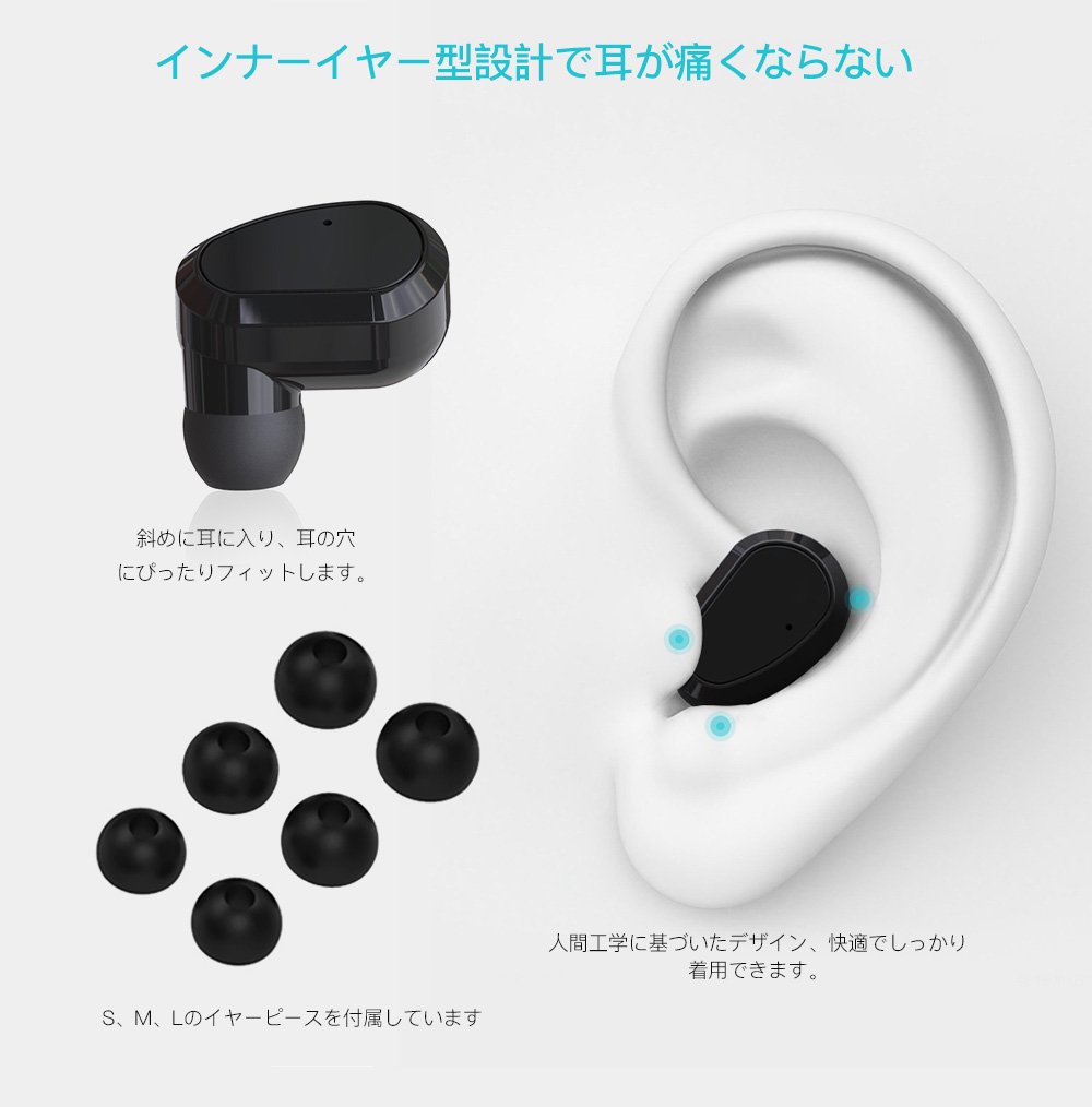 【抜群なフィット感&コンパクト】:人間工学に基いたインナーイヤホンタイプなので、しっかりしたデザインで耳の形状非常に合わせやすいし、片耳僅か4gで落ちにくい、耳の負担にもまりません。柔らかいS/M/Lのイヤピースを付属し、長時間の装着でも高い快適性です。トレーニング、ドライブ、ウォーキング、デスクワーク、作業中、通勤、通学、DVD鑑賞、電話会議など、様々なシーンで長時間つけても快適にご使用いただけるのです。