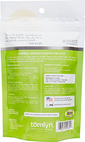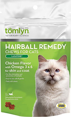 -. Binding : Misc. -. Brand : Natural Hairball -. EAN : 0802694289569 -. Feature : Gentle but effective lubricant for the elimination and prevention of hairballs / Helps eliminate hairball in the litter box rather than create a mess on the floor / Safe and effective hairball treatment best used daily to prevent and treat hairballs / Regular use coats swallowed hairballs and allows them to pass through the intestinal tract / Tasty soft chew makes administering to your cat easy and enjoyable -. Label : Tomlyn USA -. Manufacturer : Tomlyn USA -. PackageQuantity : 1 -. ProductGroup : Pet Products -. ProductTypeName : PET_SUPPLIES -. Publisher : Tomlyn USA -. Studio : Tomlyn USA -. Title : Tomlyn Laxatone Hairball Remedy Chicken Flavor Cat Chews, 60-count -. UPC : 802694289569