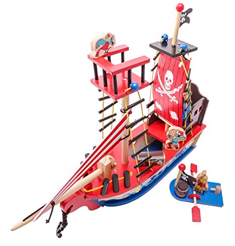 -. Feature : Wooden Pirate Ship Play Set with separate row boat / Accessories include row boat with moveable oars, rotational tiller & pirate flag, 2 different pirate characters, a parrot, a treasure chest and a barrel / Ship features 4 rope ladders, a pirate flag, main sail, head sail, crow's nest, anchor, 2 rotational ship wheels and portholes / Ship dimensions: 17" x 4.75" x 15" / Ages 3+