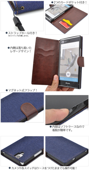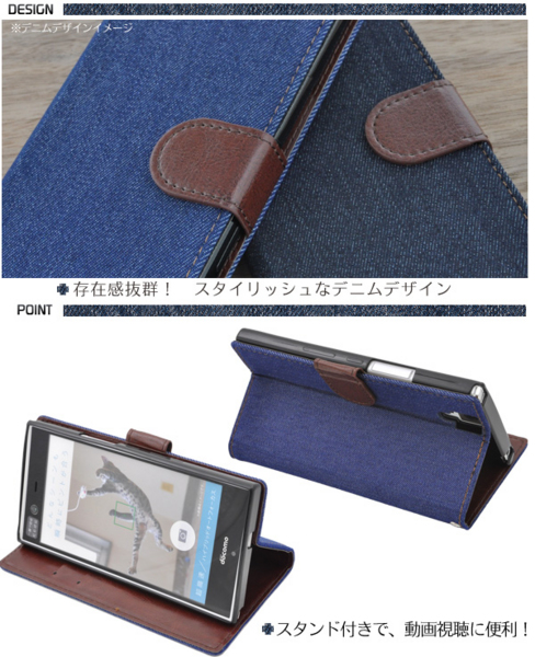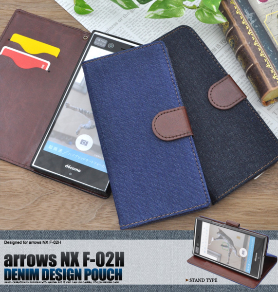 デニムデザインのarrows NX F-02H用スタンドケースポーチ。