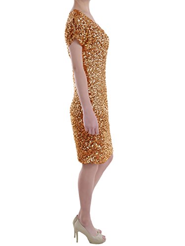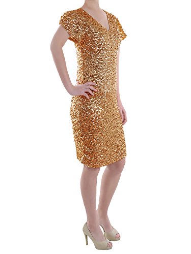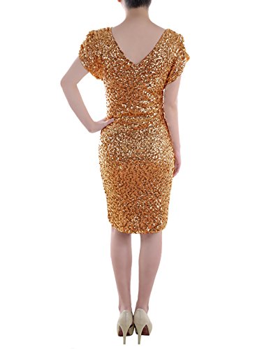 A lined, sexy short sleeve bodycon sequin dress with v neck and back.