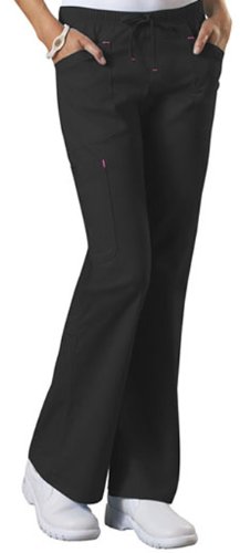 A modern classic fit, mid rise, flare leg drawstring pant features an elastic waist, shaped front and back yoke, front patch pockets, right side cargo pockets and an extra instrument/cell phone pocket. Also featured is a right back pocket with a contrast box stitch, contrast bar tacks on the pocket edges and a back leg seam. Inseam: 31 inchFeature