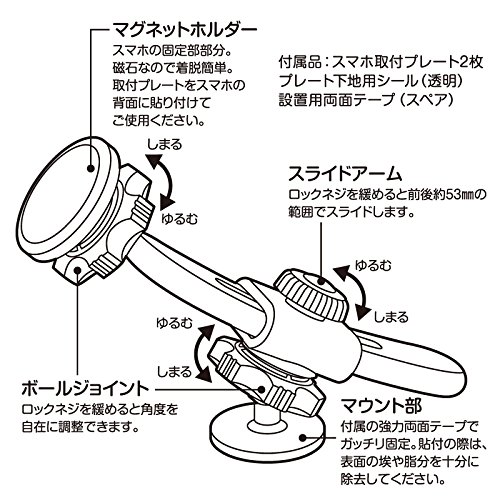 -. Feature : 最小時サイズ(約) : W40×H50×D140mm / スマホ固定幅 : 幅58~80mm、厚さ14mmまで対応 / 製品重量 : 60g / 付属品 : スマホ取付用プレート2枚、設置用テープ(スペア)