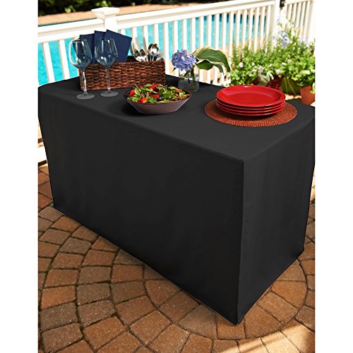 - Fitted tablecloth designed to completely cover inexpensive folding tables for a formal look.