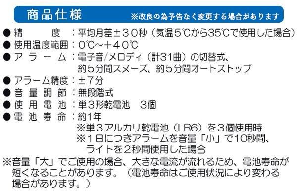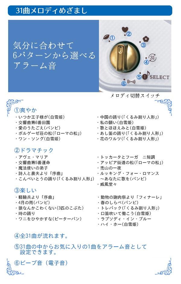 | 31曲のメロディアラームを贅沢に搭載した目ざまし時計。 |