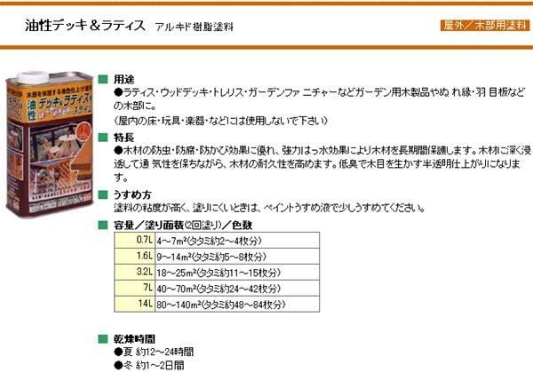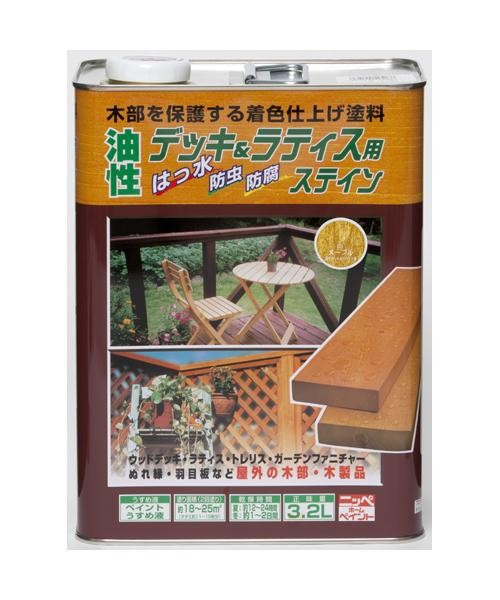 ラティス・ウッドデッキ・トレリス・ガーデンファ ニチャーなどガーデン用木製品やぬ れ縁・羽 目板などの木部にお使いいただけます。 製造国:日本 素材・材質:アルキド樹脂塗料 内容量:3.2L ※サプライヤー直送品  ご注文後2~3営業日後の出荷となります【商品名】ニッペ ホームペイント ガーデニング木部用塗料 油性デッキ&ラティス 3.2L  02・けやき