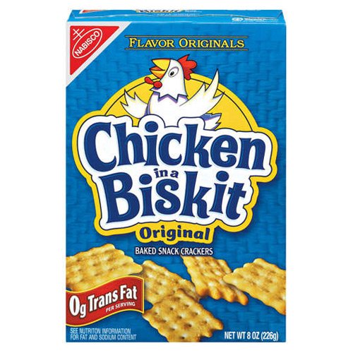 -. Binding : Misc. -. Brand : Nabisco -. Feature : Made with cooked chicken for natural flavor. / Cholesterol-free; no trans fats; 6% RDA of iron per serving. / Crunchy, light and perfectly seasoned baked crackers. -. NumberOfItems : 1 -. PackageQuantity : 1 -. ProductGroup : Grocery -. ProductTypeName : GROCERY -. Title : Nabisco Chicken in a Biskit Crackers (Original), 8 oz