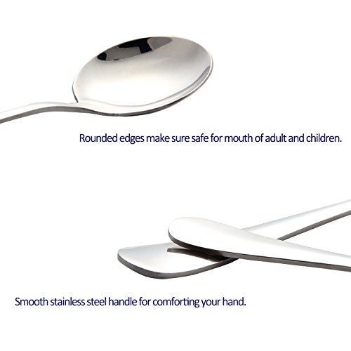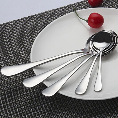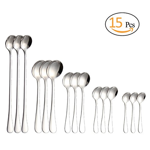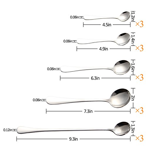 These spoons are thick, also elegant which are perfect for coffee, tea, ice cream, dessert, soups and stews. They could be used as serving spoons, but also as best intended for a high quality alternative utensil. It contains 5 different sizes:3 pcs * 9.3", 3 pcs * 7.3", 3 pcs * 4.9", 3 pcs * 4.5 ".