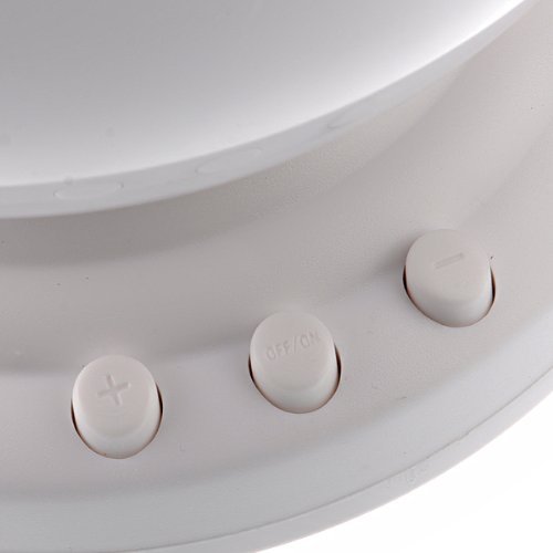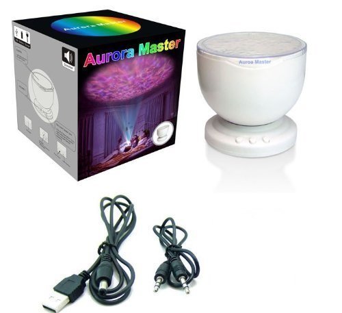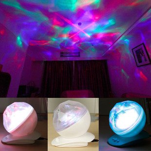 Mini-Wave Projection Lamp features a built-in mini speaker in which you can just plug in your iPod or mp3 Player and enjoy the music. The 12 LED lights project multicolor, blue, red and green light for a relaxing experience. The lamp features an energy saving optional shut off after an hour so it will turn off once you fall asleep. The lamp requires 3 AA batteries (not included).Feature