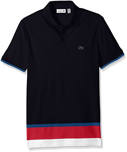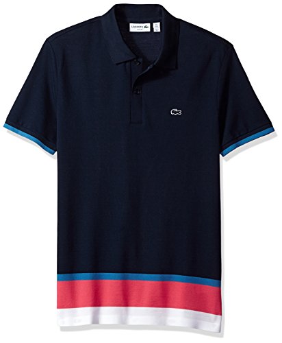Lacoste Men's Short Sleeve Engineered Stripe Botton Pique Slim Polo, Navy Blue/White/Sirop Pink/Thermal Blue, 5