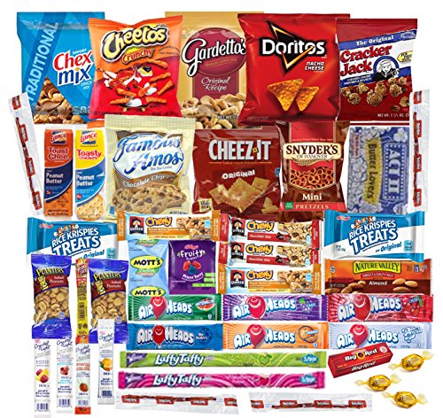 -. Feature : Care package boxes will be consistent, you will get what you see in images and read in the description. You will know exactly what you are sending every time. Includes a 6 quart Re-usable Snack Bin carefully packed full of the best and most loved snacks on the market. Each bin will be shrink wrapped for safe travels. Bin measures 14" x 9" x 5". / Nature Valley Sweet and Salty Nut Almond Granola Bar -1 (1.2oz), Rice Krispies Treats- 2 (1.3oz each), Quaker Chocolate Chip Granola Bars- 2 (.84oz each), Quaker Peanut Butter Chocolate Chip Granola Bars- 2 (.84oz), Big Red Gum- 1 (5 sticks) / Laffy Taffy Ropes - 2 (1 Green Apple, 1 Strawberry), Airheads-6 (.55oz : Random flavors, may be Blue Rasp, Grape, Orange, Watermelon, Mystery, or Cherry), Twizzlers- 4 Individual Strawberry Twists, Motts Fruit Snacks- 1 (.8oz), Kellogg's Fruit Snacks- 1 (.8oz) Packaging types may variety / Cheez-its - 1 (1.5oz), Lance Toasty Cracker with Peanut Butter- 1 (6ct pack), Lance Toast Chee with PB- 1 (6ct pack), ACT II Popcorn Butter Lovers- 1 (2.75oz Bag), Cracker Jacks- 1 (1.25oz), Gardetto's- 1 (1.75oz) / Doritos-1 (1oz), Cheetos-1 (1oz) *Snyder Pretzels- 1 (1.5 oz), Planters Peanuts- 2 (1oz), Slim Jims- 4 (.28 oz), Famous Amos Chocolate Chip Cookies- 1 (2oz), Blow Pops Full Size- 4 (flavors chosen at random), Tootsie Pops Full Size-4 (flavors chosen at random), Crystal Light Sticks- 4 (1 of each flavor: Lemonade, Cherry Pomegranate, Wild Strawberry with Caffeine, Raspberry Lemonade)