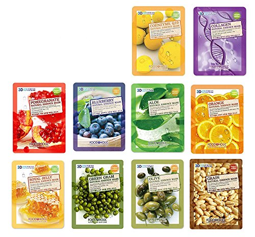 - Feature : 10 pcs FOODAHOLIC 3D Natural Pulp Face Mask Sheet + 1pcs Free NAEXY 2-Steps Double Effects New Facial Mask Sheet (Total 11pcs) Made in Korea / Mix A-10pcs batch includes the following types: 1 each COENZYME Q10, COLLAGEN, POMEGRANATE, BLUE BERRY, ALOE, ORANGE, ROYAL JELLY, GREEN GRAM, OLIVE, GRAIN / Moisturizes, Repairs, Revitalizes & Nourishes Skin / Direction: 1. After washing face apply on mask. 2. 20~30 minutes later take off the mask and tap gently excess amount of essence onto the skin. / Made in Korea