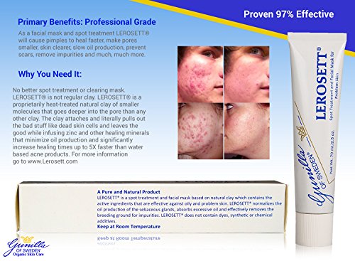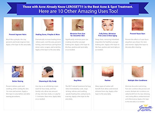 LEROSETT® Organic Acne Clay Treatment is no ordinary clay. Unlike other brands, LEROSETT® Organic Acne Clay Treatment is specially heat-treated breaking down the molecular size of each individual clay particle and contains only beneficial nutrients. This allows up to 5X more nutrients to enter pores and effectively absorb toxins and repair damaged skin. LEROSETT® Organic Acne Clay Treatment with its natural ionic charge attracts positively charged impurities and toxins and ignores negatively charged nutrients. Zinc, Magnesium, Calcium, and Iron minimize oil production, redness and swelling while fighting infection and promote healing. **When LEROSETT Clay is exposed to freezing temperatures, it becomes damaged and ineffective. When temperatures are freezing in most of the country, shipments containing LEROSETT® Clay Treatment will be temporarily delayed to prevent damage.**Feature