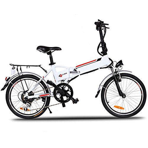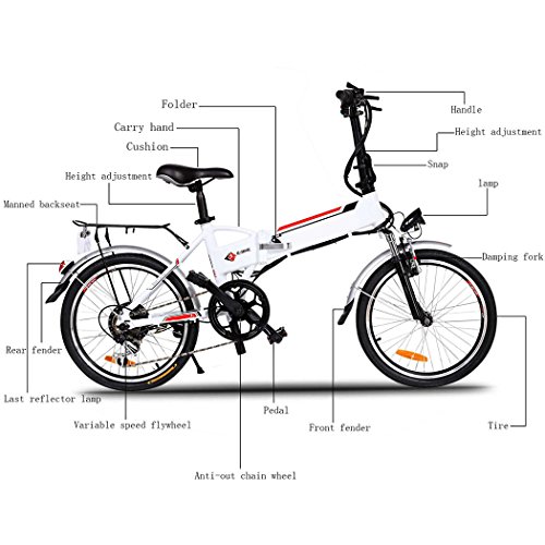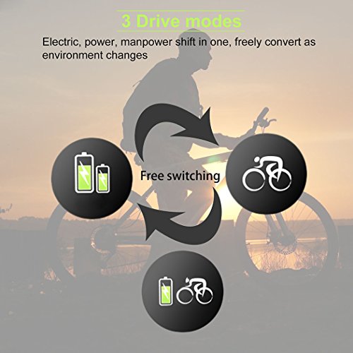 Front Fork: High-strength carbon steel comfort shock absorption Tire: High quality lithium tire Back Shelf: High-carbon steel high strength simple Brake system: Front Aluminum Alloy V Brake, Back Electric vehicle brake Gear shift system: Back 7-speed transmission system Handlebars: Aluminum Alloy Lithium battery: 36V Charger: Smart Lithium battery charger Motor: 250W high speed brushless gear motors Saddle tube: Aluminum Alloy Extended seat tube Meter: 3-speed smart meter button Headlight: Bright LED headlamp and horn Front and rear wheels: Double layer Aluminum Alloy wheel Fender: Roasted silver paint iron Fender Charging time: 4-6 hours Features: 1: 1 booster riding, Pure electric riding, Pure human riding