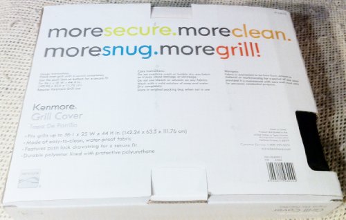 -. Brand : Kenmore -. Color : Black -. EAN : 0634385783717 -. Feature : Fits grills up to 56 L x 25 W x 44 H in (142.24x63.5x111.76 cm) / Made of easy-to-clean water-proof fabric / Features push lock drawstring for a secure fit / 100% polyester woven with polyurethane coating / Kenmore Grill Cover -. IsAutographed : 0 -. IsMemorabilia : 0 -. Label : Kenmore -. Manufacturer : Kenmore -. Model : 28 23656 -. MPN : 05040909-3 -. PackageQuantity : 1 -. PartNumber : 05040909-3 -. ProductGroup : Lawn & Patio -. ProductTypeName : OUTDOOR_LIVING -. Publisher : Kenmore -. Size : 56x25x44 -. Studio : Kenmore -. Title : Kenmore Grill Cover 56x25x44 -. UPC : 634385783717 -. Warranty : Fabric is warranted to be free from defects in material or workmanship for a period of one year provided it is maintained with care and used only for personal, residential purpose.