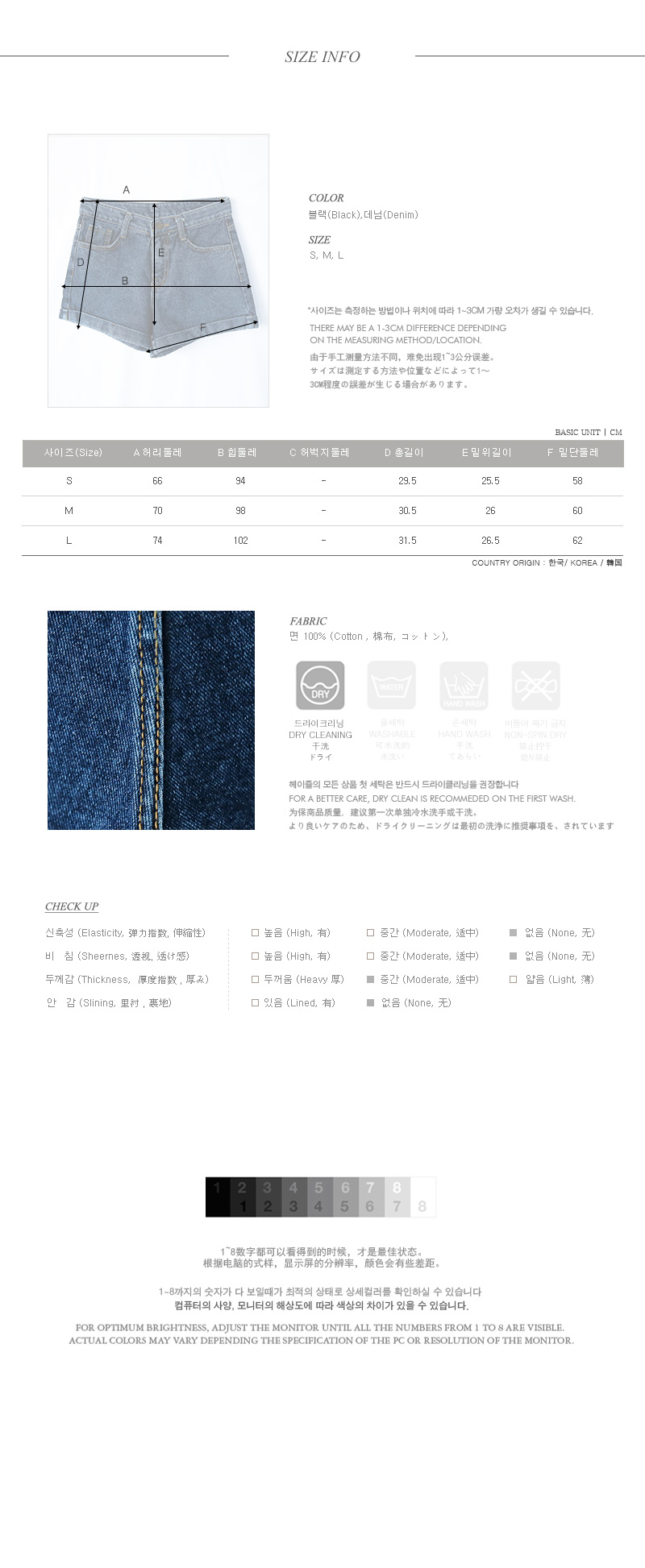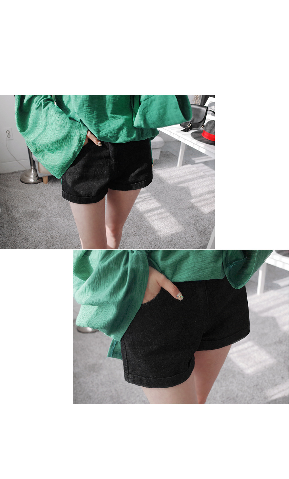 데일리하게 즐기기 좋은 데님 숏팬츠! 어디에나 매치 가능한 완소 아이템이죠^^ 허리를 살포시 감싸주면서 살짝 여유있게 떨어지는 숏한 길이감이 날씬한 바디라인을 보여주는 데님 숏팬츠구요! 소재의 부담없는 데일리 워싱이 빈티지하면서도 캐주얼한 무드를 더하며, 밑단의 롤업 디자인이 밋밋함없는 디테일을 더해주는 아이템이랍니다^^ 데일리하면서도 캐주얼하게 즐기기 좋아 컬러별 소장도 손색없는 숏팬츠에요~