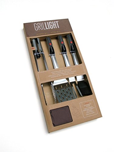 - Set of 4 stainless steel grilling tools set with LED flashlight built into the handles; adjustable apron included