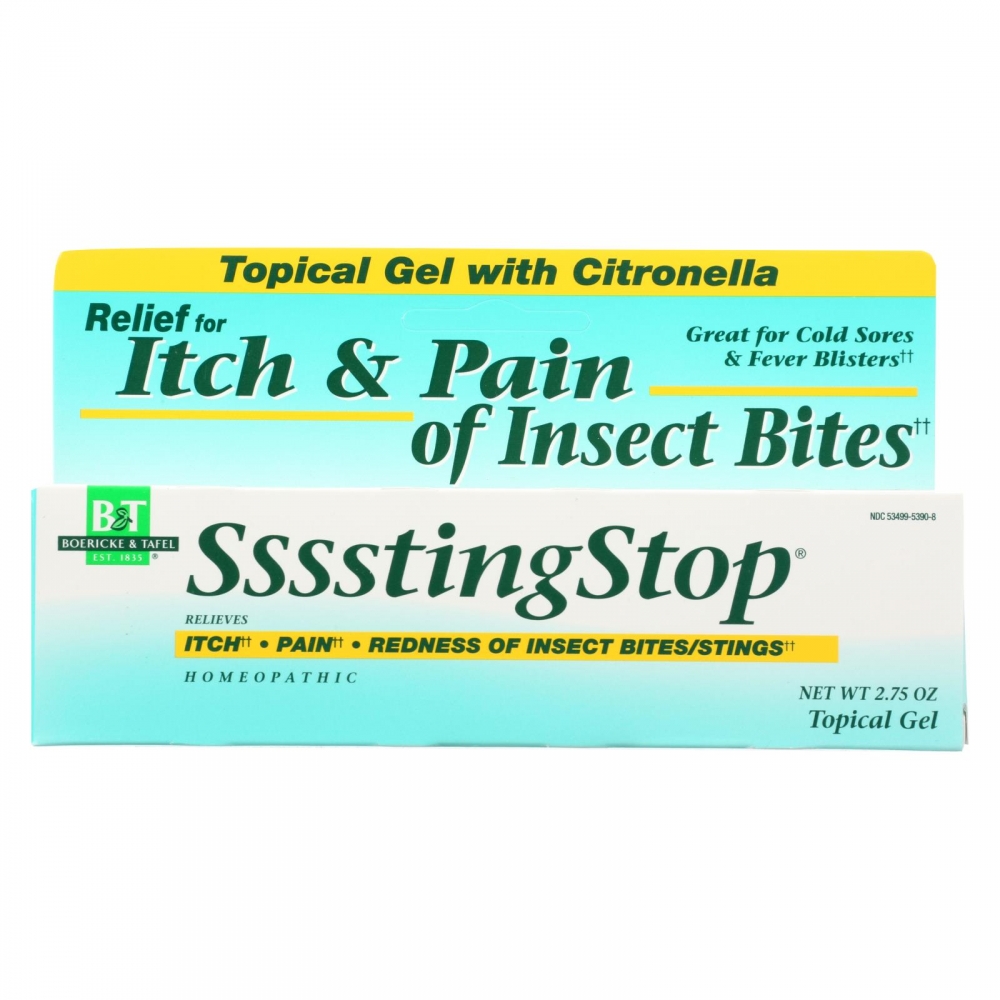 | Boericke and Tafel Ssssting Stop Topical Gel Description: Relieves Itch, Pain and Redness Of Insect Bites And Stings Natural Homeopathic Safe And Effective Fast Relief For Itch And Pain Of Insect Bites Great For Fever Blisters And Cold Sores Insect Gel With Citronella Doesn't Burn Or Chill Safe And Effective No Animal By-Products Readily Absorbed By The Skin No Animal Testing Clinically tested, proven effective! The London School of Hygiene and Tropical Medicine conducted two double-blind clinical studies using mosquitoes which had not been fed for 24 hours and human volunteers. The tests prove conclusively that the medicines in Ssssting Stop provide dependable, effective relief. Free Of animal by-products and animal testing Disclaimer These statements have not been evaluated by the FDA. These products are not intended to diagnose, treat, cure, or prevent any disease. Ingredients : 10% Echinacea angustifolia (cone flower), 10% Symphytum (boneset 1X, 10% Ledum (wild rosemary) 1X, and 10% Urtica dioica (common nettle) 1X. Size : 2.75 OZ Pack of : 1 Product Selling Unit : each |