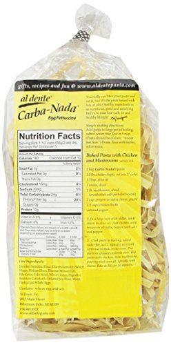 -. Binding : Misc. -. Brand : Carba-Nada -. EAN : 0081475405569 -. Feature : Lower Carbs Than Regular Pasta / Sugar Free / 1g of Fat per serving / 18g Net Carbs Per Serving / Diabetic-Friendly -. IsAdultProduct : 0 -. Label : Al Dente Pasta Company -. Manufacturer : Al Dente Pasta Company -. Model : lowce -. MPN : lowce -. NumberOfItems : 1 -. PackageQuantity : 1 -. PartNumber : lowce -. ProductGroup : Grocery -. ProductTypeName : GROCERY -. Publisher : Al Dente Pasta Company -. Size : 10 -. Studio : Al Dente Pasta Company -. Title : Carba-Nada Low Carb Egg Fettuccine Pasta 10 oz. bag -. UPC : 081475405569