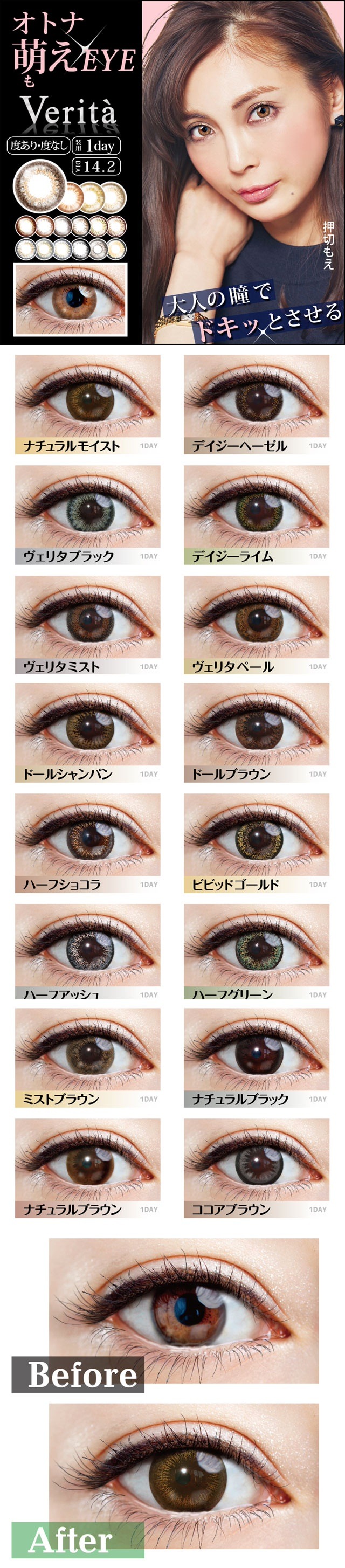 ナチュラルモイスト / デイジーライム / デイジーヘーゼル / ハーフショコラ / ヴェリタミスト / ヴェリタブラック / ヴェリタペール / ハーフアッシュ / ドールシャンパン / ドールブラウン / ハーフグリーン / ビビットゴールド / ナチュラルブラック / ナチュラルブラウン / ココアブラウン / ミストブラウン