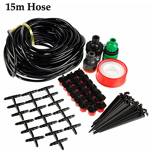 -. Feature : 15m micro drip irrigation kit is used for agriculture, lawn, garden, patio, greenhouse, sw imming pool misting fog cooling/irrigation, watering, greenhouse, humidification, balcony cooling, irrigation. Allows you to enjoy the cool of the summer terrace and water your plants in the garden. / Specification: Flow: 0-70L/H Working pressure: 1-3kg Maximum water spraying diameter: 1.3m PE hose lenght: 15m / 50ft (ID4mm/OD7mm) / Feature: Connect with 1/2'' or 3/4'' male thread water faucet According to the actual need, dripper can be adjusted the water yield through rotating the screw. It is a self-cleaning type that have a good anti-clogging performance. / Drip is flexible and convenient that can install kinds of specifications of the hose. Meet greenhouse nursery, flower crops on the stringent requirements of the mist / Package include: 1 x 15m Hose 1 x Tape 3 x Tap Quick Connectors 19 x Tee Joints 20 x Adjustable Drippers 20 x Fixed Stem Tip: Please put the connected part of the micro hose into the hot water for 10 seconds before assembling.