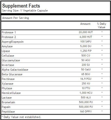 CONTAINS 18 DIFFERENT ENZYMES This rapid absorbing advanced clinical strength high grade enzymatic therapy complex pill is infused with pure Alpha Galactosidase and Pectinase which help digest legumes beans and vegetables. It also contains Amylase Malt Diastase Hemicellulase which help digest carbohydrates. Digestive enzymes Bromelain Papain and Protease are for protein while Invertase and lactase are for dairy as well as sugar which leaves xylanase and cellulose are for plant wall and fiber.