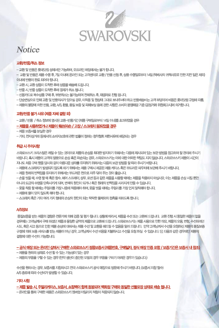 흠 없이 완벽한 깨끗함, 독특한 커팅, 찬란하게 빛나는 광채로 세계적인 명성을 지닌 스와로브스키는 컷 크리스털 세계의 진수를 보여줍니다. 작지만 아름답고 신비로운 빛을 발산하는 스와로브스키의 크리스털은 1895년에 오스트리아에서 그 역사가 시작된 이래로 한 세기가 넘도록 그 역사와 전통을 이어 나가고 있으며, 변함없는 장인정신으로 현재 전세계 컷 크리스털 시장의 80%이상을 점유하고 있습니다. 스와로브스키 크리스털의 영역은 작은 장식품으로부터 패션 제품에 이르기까지 무궁무진하며, 현재 10만개 이상의 다양한 모양과 색깔, 크기의 크리스털 제품을 접할 수 있습니다. 현재에는 크리스털 주얼리 뿐 아니라 바젤 박람회에 매년 출품하는 시계라인과 함께 패션 브랜드로서의 인식을 강하게 심고 있습니다. 알프스 산으로 둘러싸여 있는 오스트리아 티롤 지방에서 시작된 스와로브스키의 상징은 한 마리의 우아한 백조이며, 이는 순수, 순결, 우아함, 깨끗함, 아름다움 등의 의미를 내포하고 있습니다.
