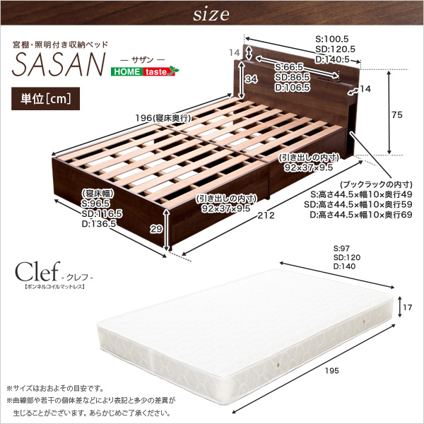 スマホ充電可能 宮、照明、チェストベッド【サザン-SASAN-(セミダブル)】(ボンネルコイルスプリングマットレス付き)