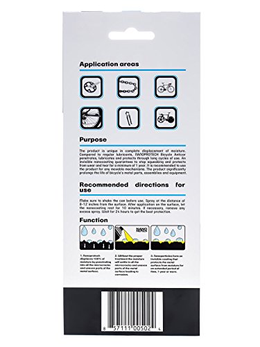 Studio : Nanoprotech Publisher : Nanoprotech Binding : Sports Product Description Purpose: the product is unique in complete displacement of moisture. Compared to regular lubricants, NANOPROTECH bicycle anticor penetrates, lubricates and protects through long cycles of use. An invisible Nano coating guarantees to stop squeaking and protects from wear and tear for a minimum of one year. It is recommended to use the product for any movable mechanisms. The product significantly prolongs the life of bicycle's metal parts, assemblies and equipment. Properties: nanoparticles penetrate into the structure of the applied surface, displace moisture, stop squeaking, prevent corrosion and build a coating that reduces friction and wear. The product does not lose its properties at a temperature range from -40 degree to 140 degree. It is harmless on all materials and can penetrate into hard-to-reach spots. The product can apply on wet surfaces and it maintains its elasticity for a long time. Application areas: chains, gear (front and rear), brake cables, threaded connections. Consumption: one can for 22 square feet. It is recommended to apply at a temperature range from - 4 degree to 95 degree. Product life span: 1 year or more after application if product used under normal circumstances. 0