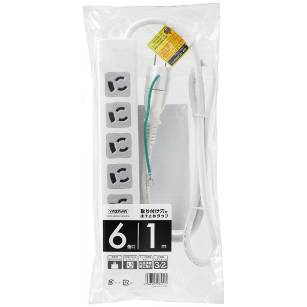 ●ヤザワ Y02EJNP601WH2PA 抜け止めタップ 3ピン式 6個口 1m 取り付け穴付 ホワイト