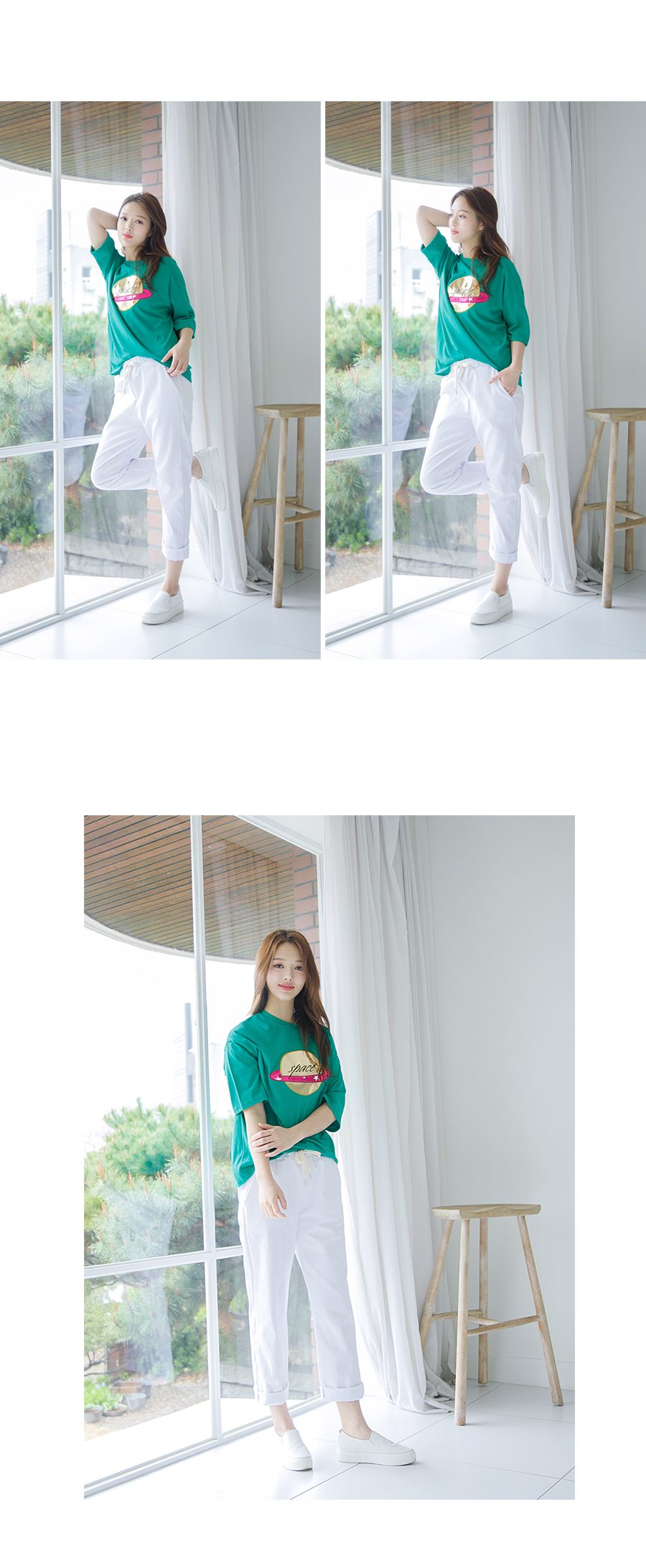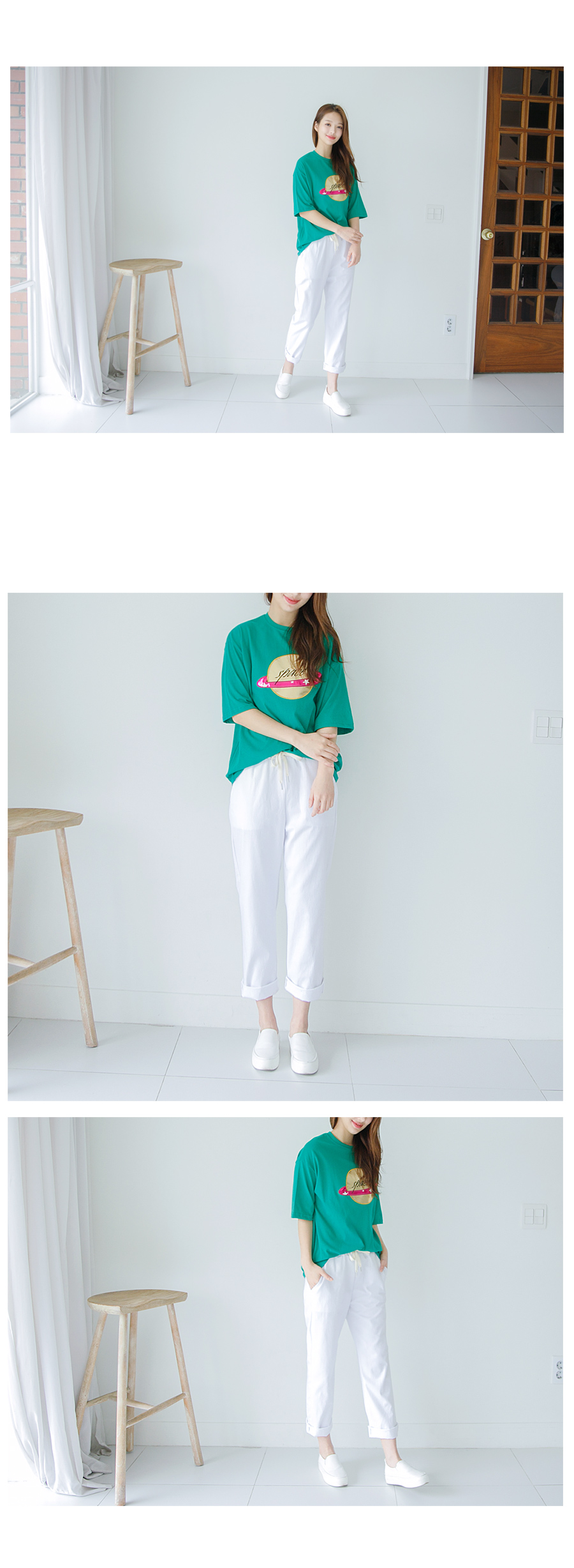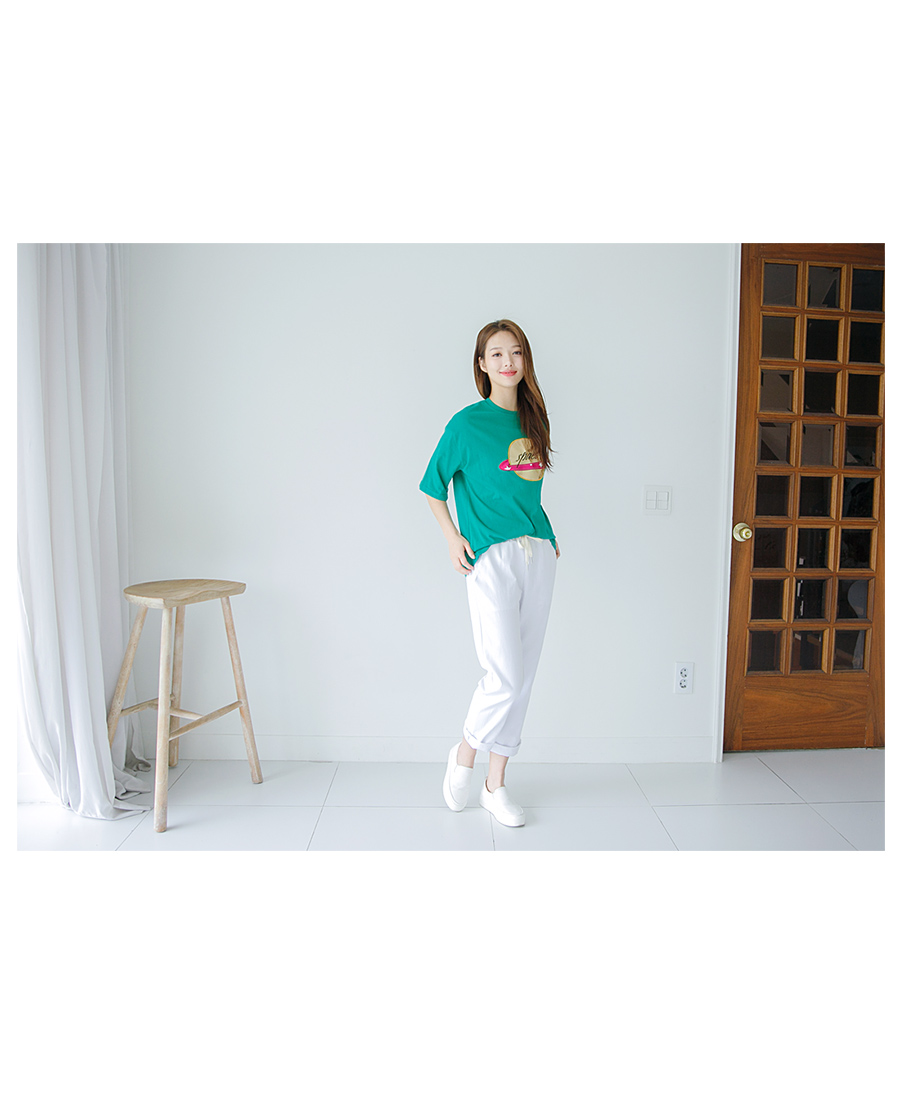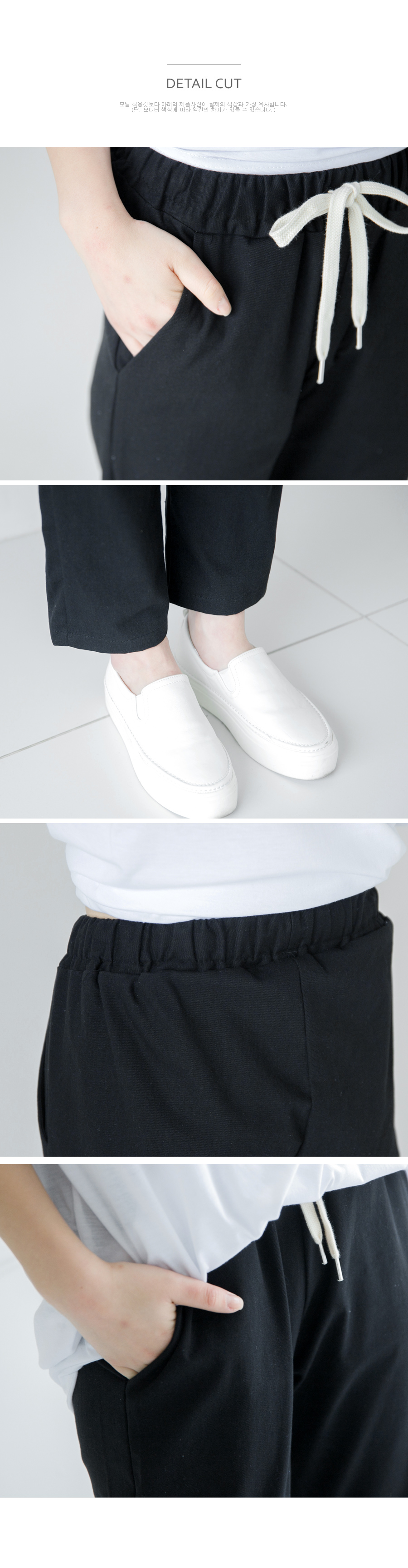 밴딩허리라 입은 듯 안 입은 듯 착용감 무지 편안하구요 허리에 끈 넣어주어 마르신 분들도 본인 사이즈에 맞게 조절하실 수 있어요~ 고슬고슬한 코튼 100% 소재로 내추럴한 느낌이구요 여름까지 입기 좋은 두께감이에요