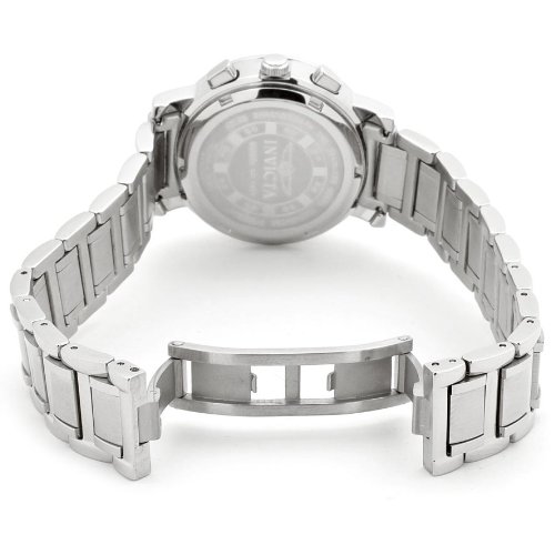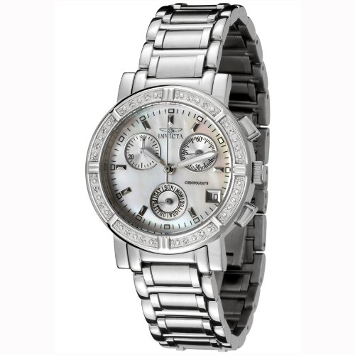 Add a dash of high style to any ensemble with this limited edition Invicta chronograph timepiece for women, which is elegantly topped by a bezel ringed with 16 hand set sparkling diamonds. The diamonds are GH color and SI clarity. The shimmery mother-of-pearl dial face includes three silver sub-dials with measurements for 1/10th of a second, 60 seconds, and 30 minutes of elapsed time as well as luminous Tritnite hands and hour markers, small minute indexes, and a date window at 4 o'clock. The round watch case measures 33mm wide (1.30 inches) and 11mm thick (0.43 inches). It's complemented by a stainless steel bracelet band that mixes polished and satin links. Other features include a precise Swiss quartz movement, a scratch-resistant sapphire crystal, and water resistance to 100 meters (330 feet)--offering protection from accidental splashes as well suitable for swimming, snorkeling, and light recreational diving.II Collection