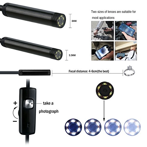 - Featuring 5M cable+1M cable: You do not have to go to the extra purchase of the replacement cable, where you will get an additional free 1 flexible meter cable ,and waterproof and 8mm diameter camera, 6 adjustable LED light on the camera, this endoscope can suitable for various types of environment, for example, low-light or dark area, damp or wet area etc. Furthermore, armed with bendable semi-rigid cable which can bend and hold it's shape to access a wide variety of confined place.