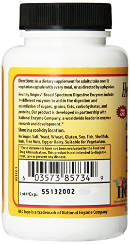 Healthy Origins Broad Spectrum Digestive Enzymes include 14 different enzymes to aid in the digestion and assimilation of sugars, grains, fats, carbohydrates, and proteins.