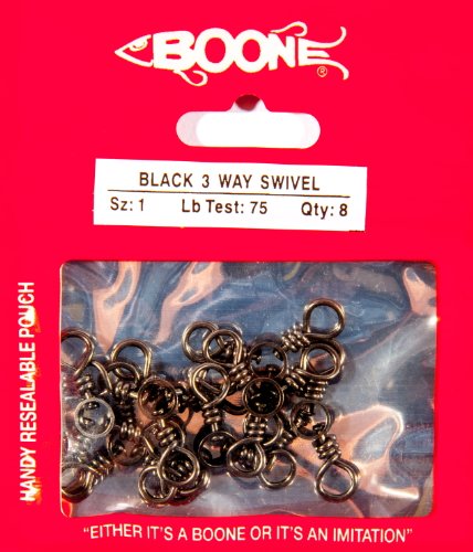 - Feature : Boone Terminal Tackle- / Quality black 3-way swivels size 1 / Test equals 75 lb. test / Designed to eliminate line twist / Color black qty. per pack 8