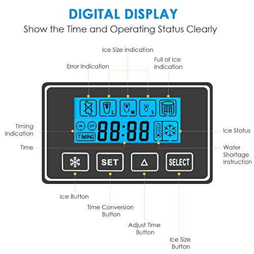 - ✔ INCLUDED INSIDE- 3 cube sizes, status, clock, timer, auto shut off, standby and refill alarm so no need to monitor, 2 quart water tank holds enough to make a generous amount of ice before refilling.