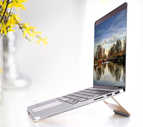 LIGHTWEIGHT, SOLID, COMPACT,PORTABLE and COOLING AIR FLOW-Easily slip this compact laptop stand in your bag and take from home, to office, to store, and back! Don’t worry about it bending or breaking, because this laptop stand which is made of ultra-sturdy aluminum alloy is lightweight, yet provides solid stability.The aluminum material of this stand naturally dissipates heat to air faster than plastic or wooden laptop docks without the use of battery power or electricity. Now that’s COOL!