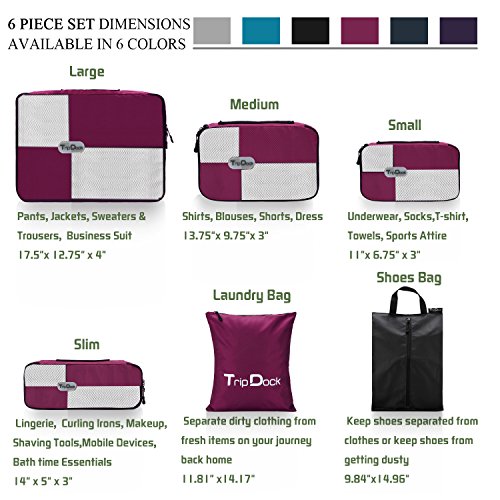 6 Set Packing Cubes:1 Large,1 medium, 1 small, 1 slim men/women toiletry bag, 1 shoe bag, 1 travel laundry bag, different cubes allow you to compartmentalize similar size items and provide optimum utilization of interior luggage space