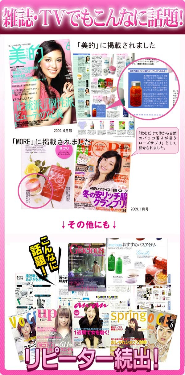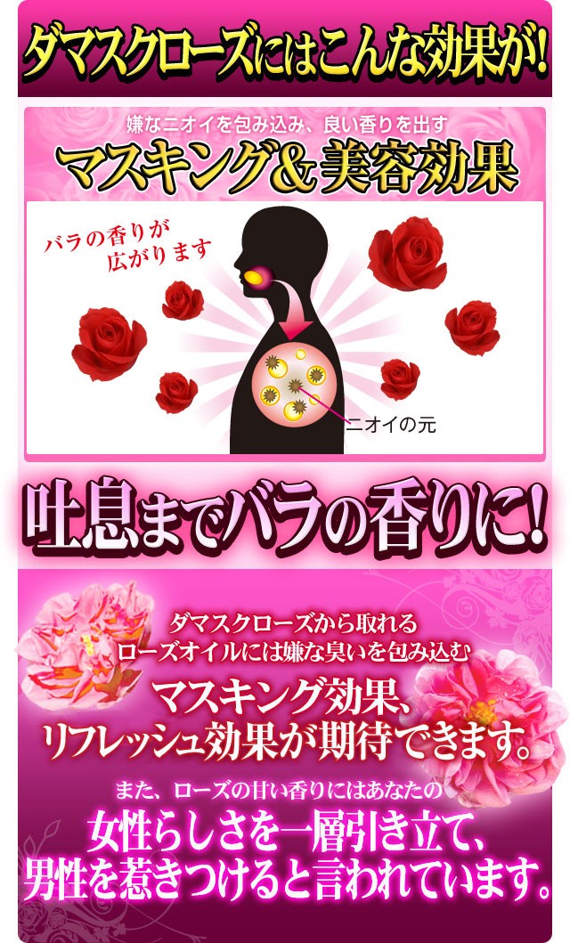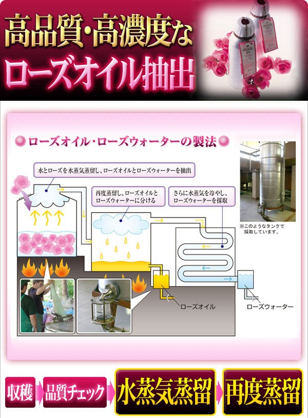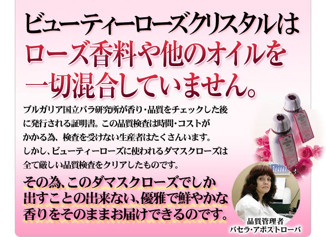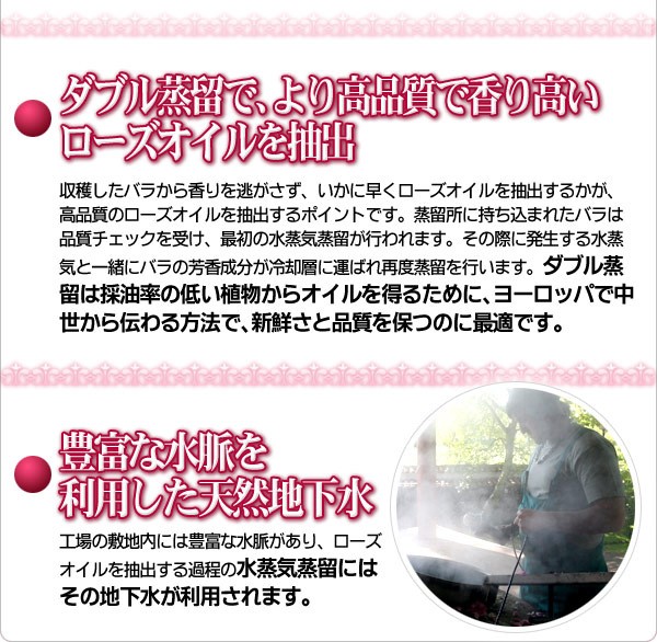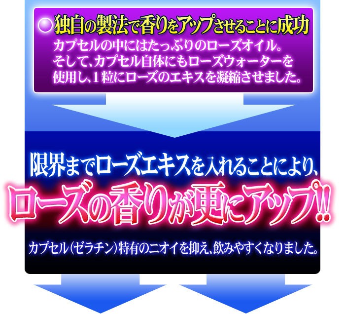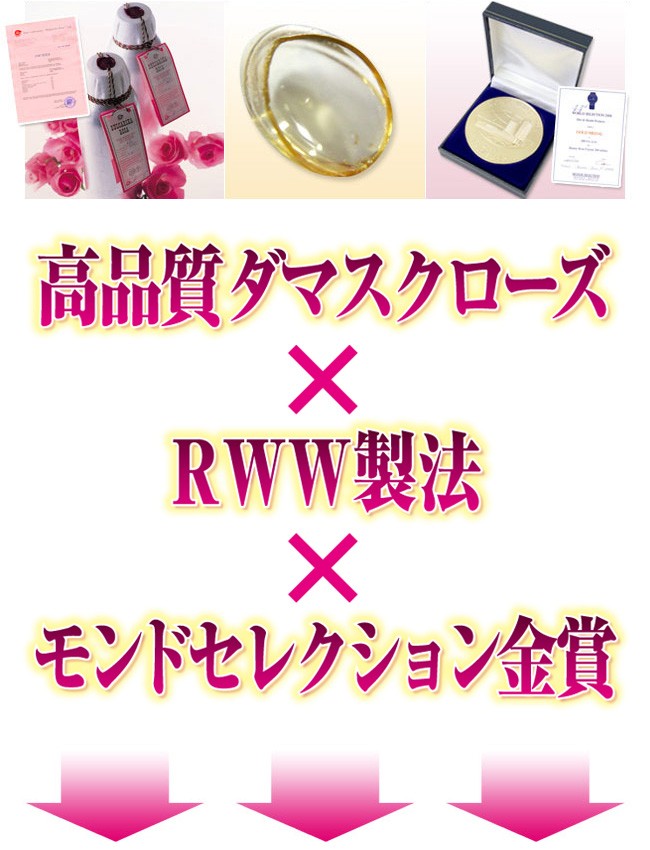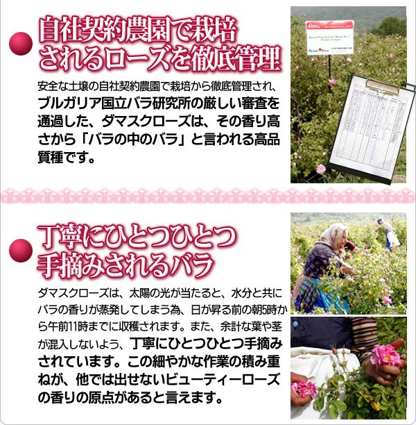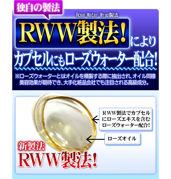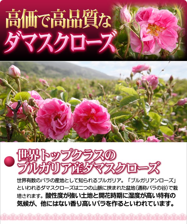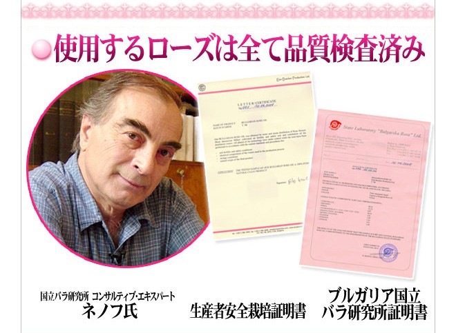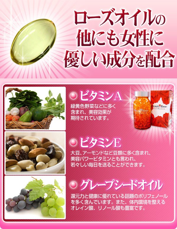 成分 グレープシードオイル、ゼラチン、ローズウォーター、ローズオイル、グリセリン、ビタミンE、ビタミンA
